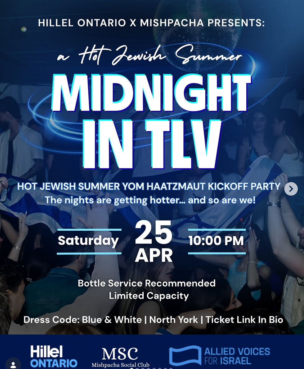 in partnership with Hillel Ontario and Mishpacha Social Club (MSC), AVI is hosting an epic Yom Ha'atzmaut kickoff party - a midnight in Tel Aviv, with over 500 people in attendance!!